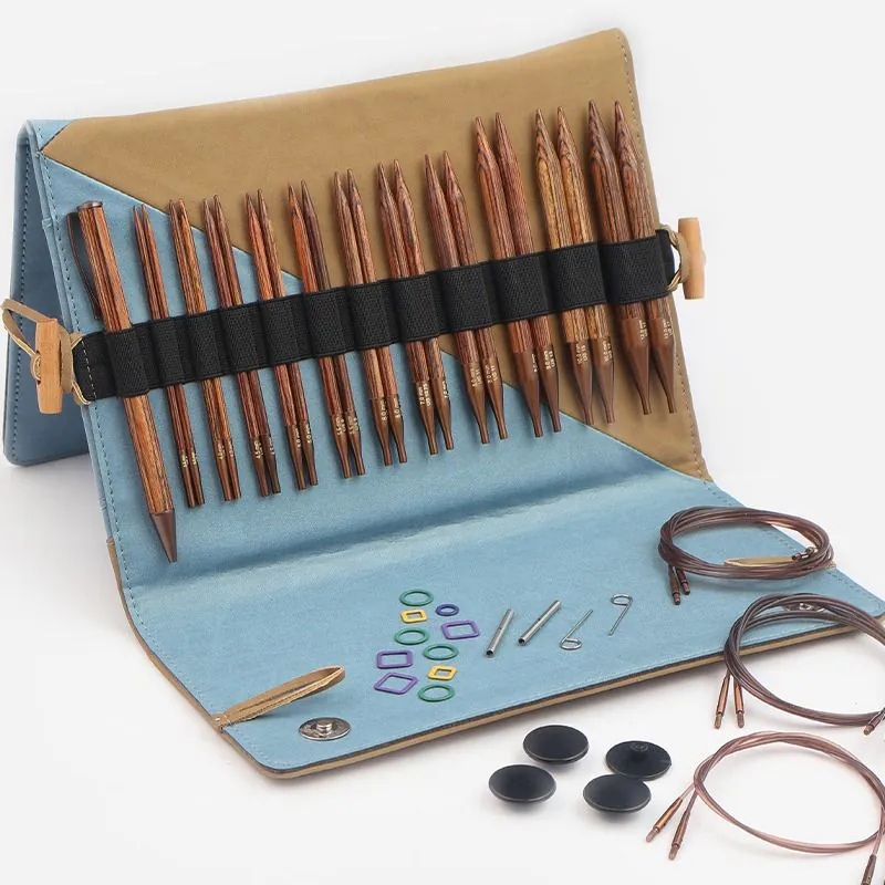 Todo el conjunto del Set de Agujas Circulares KnitPro Ginger Regal se presenta en un estuche premium de cuero ecológico con cierre. Su diseño robusto y sofisticado protege la madera de abedul y mantiene cada accesorio perfectamente clasificado, convirtiéndose en el compañero ideal para la tejedora que busca excelencia, durabilidad y estilo en cada puntada.