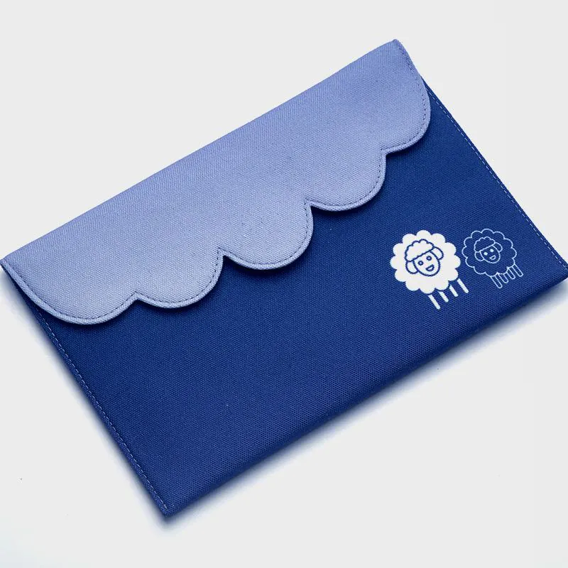 Todo el conjunto se resguarda en un encantador estuche textil azul decorado con motivos de ovejas. Este estuche no solo es resistente y práctico para el almacenamiento diario, sino que su diseño con cierre lo hace perfecto para transportar tu set completo de forma segura y organizada.