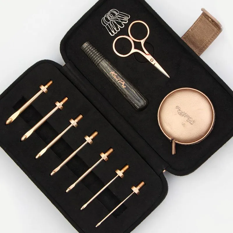 El set no solo incluye las puntas, sino un kit de herramientas de alta costura diseñado para complementar tu talento: una tijera y una cinta métrica con acabado rose-gold, marcadores de punto metálicos tipo locking y un gripper diseñado para asegurar que la unión entre el mango y la punta sea siempre firme y estable. Es la opción práctica y completa para quienes buscan un sistema compacto de crochet de precisión sin renunciar a la elegancia que caracteriza a los productos premium de KnitPro.