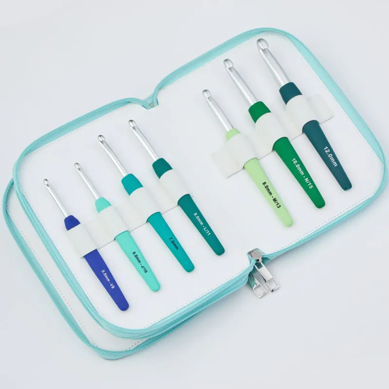 Cada aguja del set mantiene la calidad de la línea Waves: una punta de aluminio liviano de alta resistencia con un acabado pulido que garantiza un deslizamiento sedoso. El mango ergonómico de plástico suave, codificado por colores vibrantes, asegura que puedas tejer crochet durante horas manteniendo la comodidad y evitando la fatiga en las manos, sin importar si estás usando un hilo delicado o una lana de gran volumen.